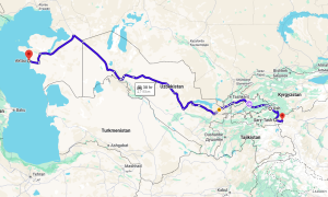 Baku → Caspian Sea Crossing → Aktau → Central Asian Steppe Corridor → Beyneu → Nukus → Urgench → Khiva (Itchan Kala) → Bukhara → Samarkand → Shahrisabz → Tashkent → Fergana Valley → Osh